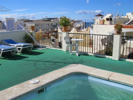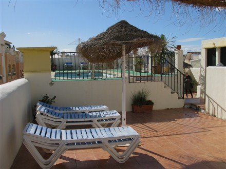 Auf der privaten Dachterrasse gibt es Sonnenliegen mit Polstern, Sonnenschirme und zwei Toiletten. Hier steht auch eine Gemeinschafts Waschmaschine zur Verfügung. Die Poolterrasse wird von nur 8 Parteien genutzt. |