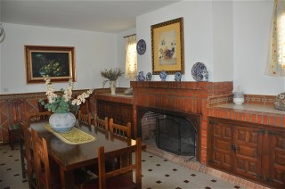 Direkt neben der grünen Couchgarnitur steht diese große Esstisch. Der offene Kamin gibt an kühlen Winterabenden angenehme Wärme. |
