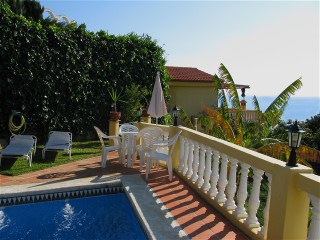Neben dem 2,6 x 5 m großen Pool gibt es eine kleine Rasenfläche. Der größte Teil des Grundstücks ist nicht einsehbar.Von der Terrasse haben Sie einen weiten Blick über das Meer und die Buchten Playa Cabria bis Playa Velilla. |