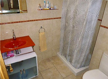 Das moderne Bad mit Dusche ist hell gefliest.Vor der Schlafzimmer vom grossen Appartement gibt es eine Markise. |